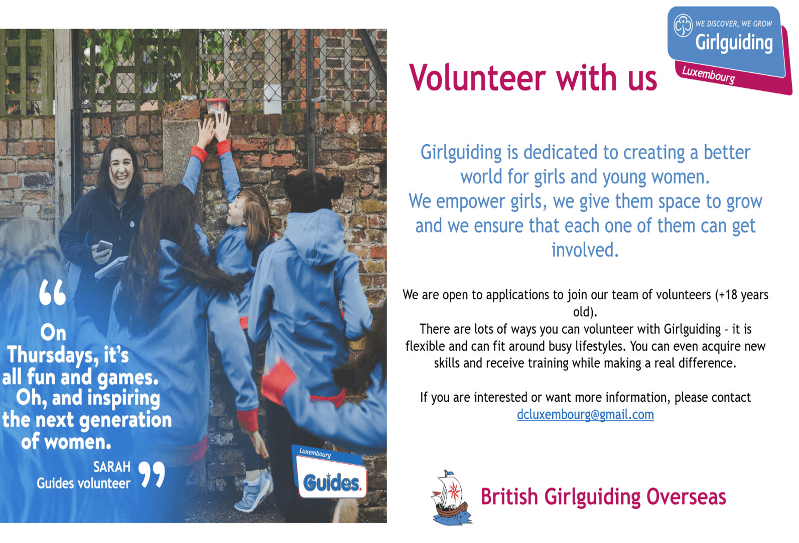 British Girlguiding Overseas by Girlguiding Published: 17 March 2018 (8 years ago) CategoryWanted / Volunteers Send Message Your Name * Your Email * Subject * Message * Website Address Posted in .